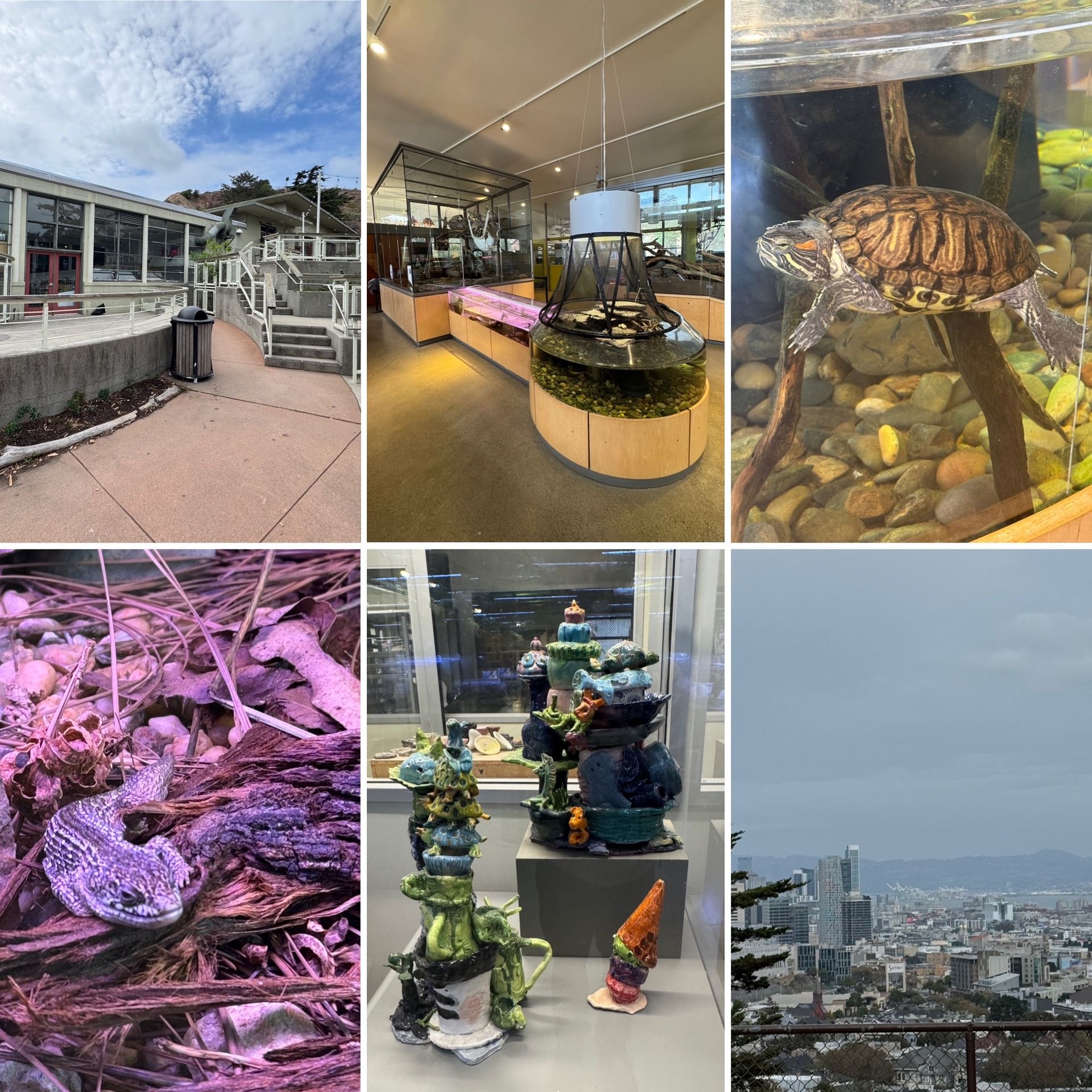 I had to take an insane uphill walk to get up to the Randall Museum, a combination natural history museum, science museum, and arts center showcasing the importance of conservation and protection of our natural world. Itās a tiny spot that has several animals from the diverse habitats of California; however, most of the animals were nocturnal, like the weasel and raccoon, so I didnāt get to see them. I did meet a couple of reptiles, including a turtle, a snake, and a lizard (side note: why do some animals have such scary names? I mean, I donāt know about you, but I wouldnāt want to be anywhere near a Death-Feigning Beetle). There was also some art and pottery on display. The place felt geared more towards kids, but it was free, and I got my workout in for the day getting there. Additionally, the museum itself had a wonderful view of SF.