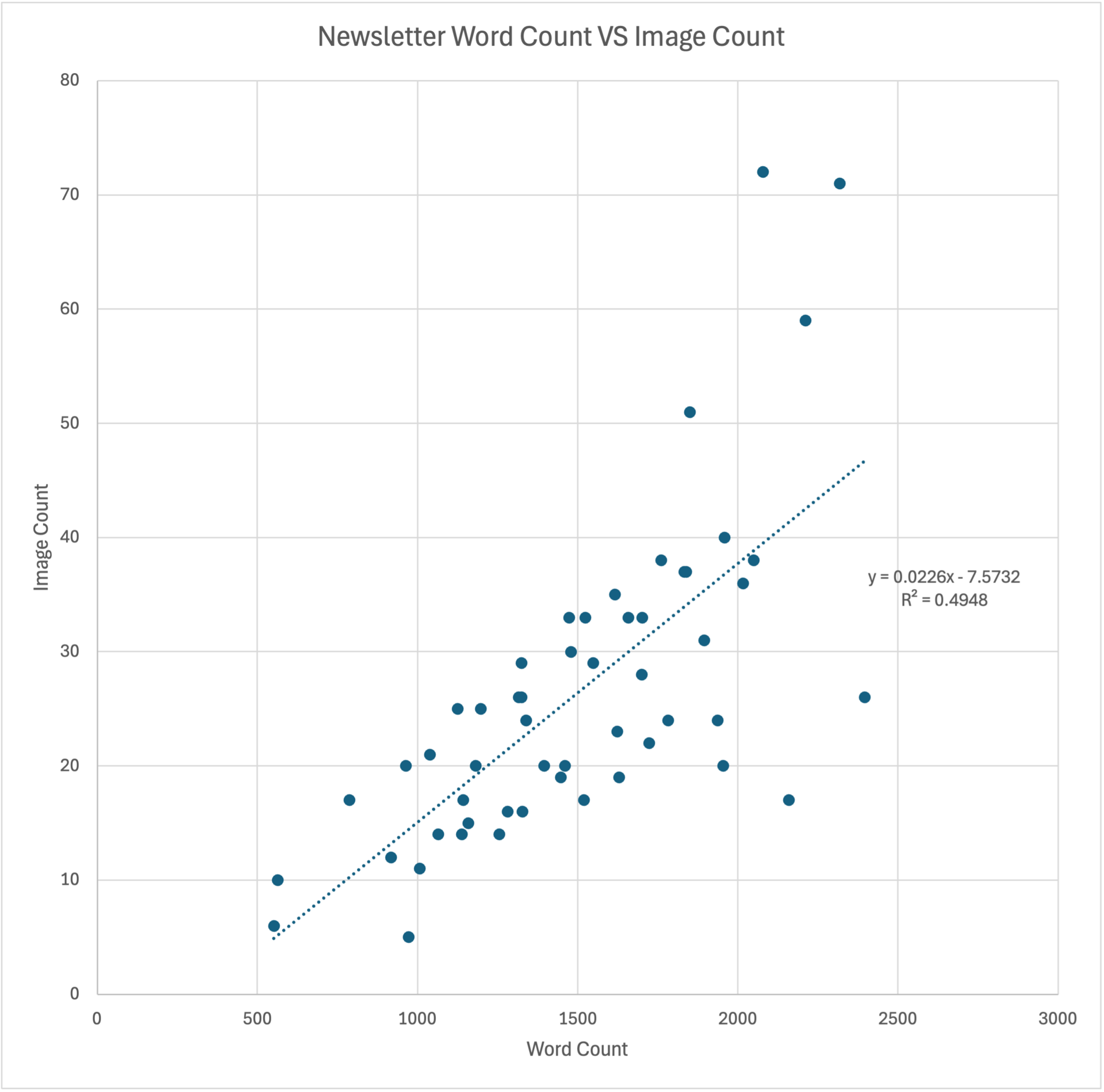 I wanted to see the correlation between word count and image count, so I created a graph. I went in with the assumption that more words mean more pictures, and overall, the trend is statistically present. The trend line for the data was y = 0.0226x - 7.5732. This means that on average, my first image is after 379.34 words. Furthermore, the R2 value is .4948, meaning that about 50% of the variation in the number of photos can be explained by the number of words in a post. In other words, about half of what determines photo count is based on the number of words, and the other half is due to factors I did not include (life, how many things I did, how many pictures I took in each event, how I was feeling when writing a particular newsletter, etc.). As we all know, in life, sh*t happens.