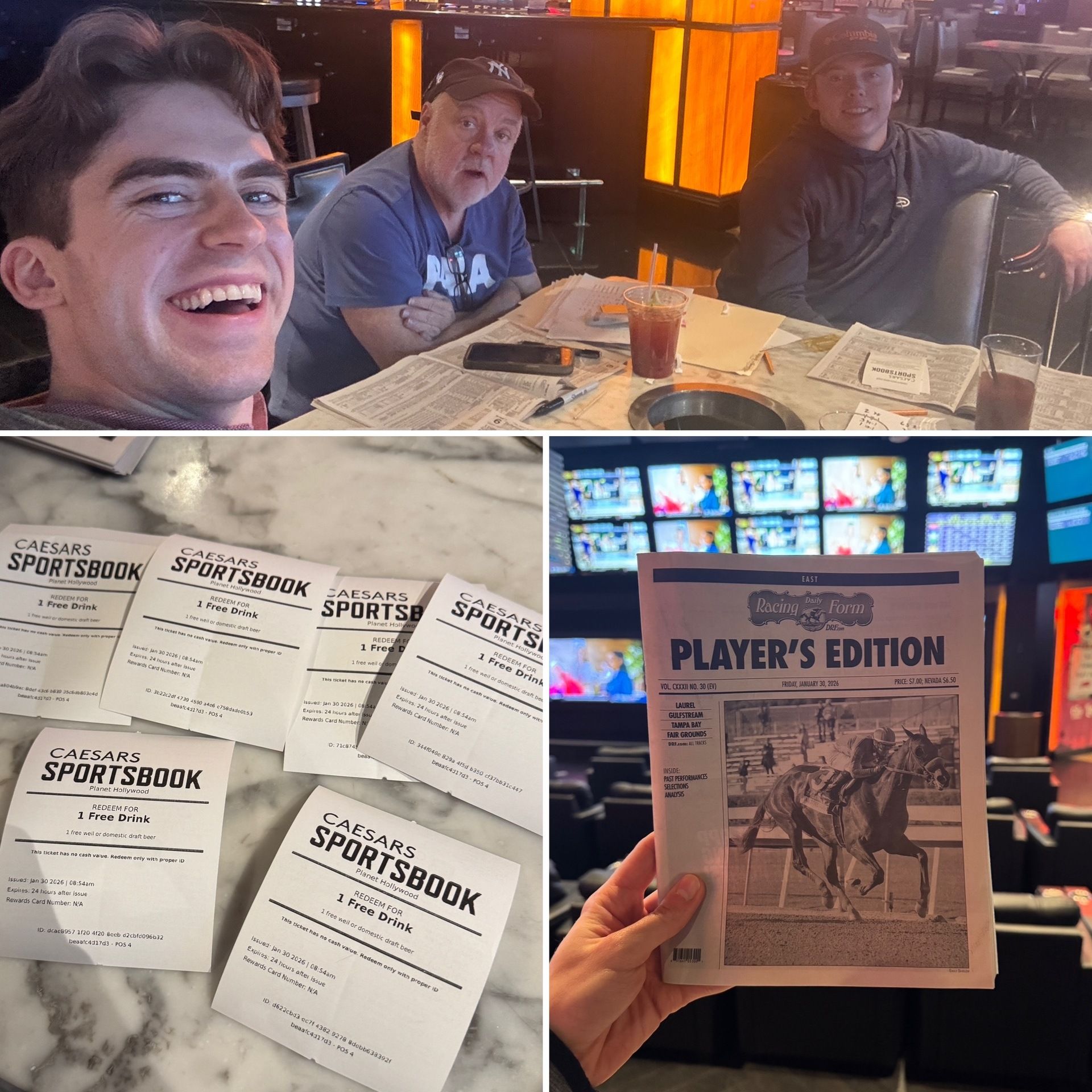 We started our day on Friday by hitting up the sports book for some clean old-fashioned horse race betting. For some reason, Planet Hollywood is the only sports book in Vegas that simulcasts horse racing. However, with the rise of online gambling and the decentralization of sports betting to a particular place, the actual sports book attendants seem to be feeling the pressure. We have found that if you tip them a little bit, they will give you non-stop free drink tickets. I think this trip, they ended up giving us 15-20 drink tickets.