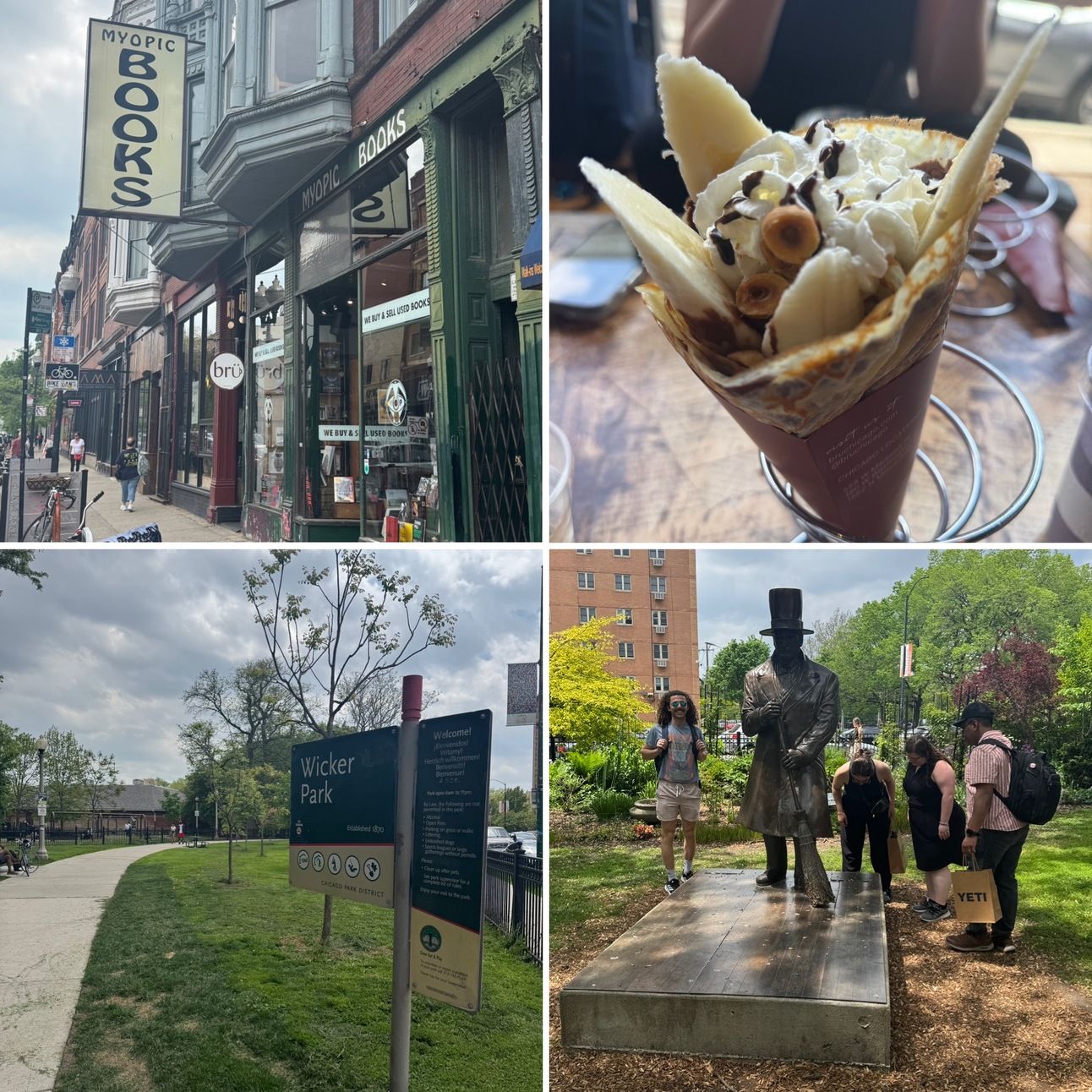 Our first stop was Wicker Park, one of the trendier neighborhoods. We stopped for Crepes for breakfast at BrĂĽ, walked around a three-story bookstore called Myopic Books, and checked out the actual Wicker Park.