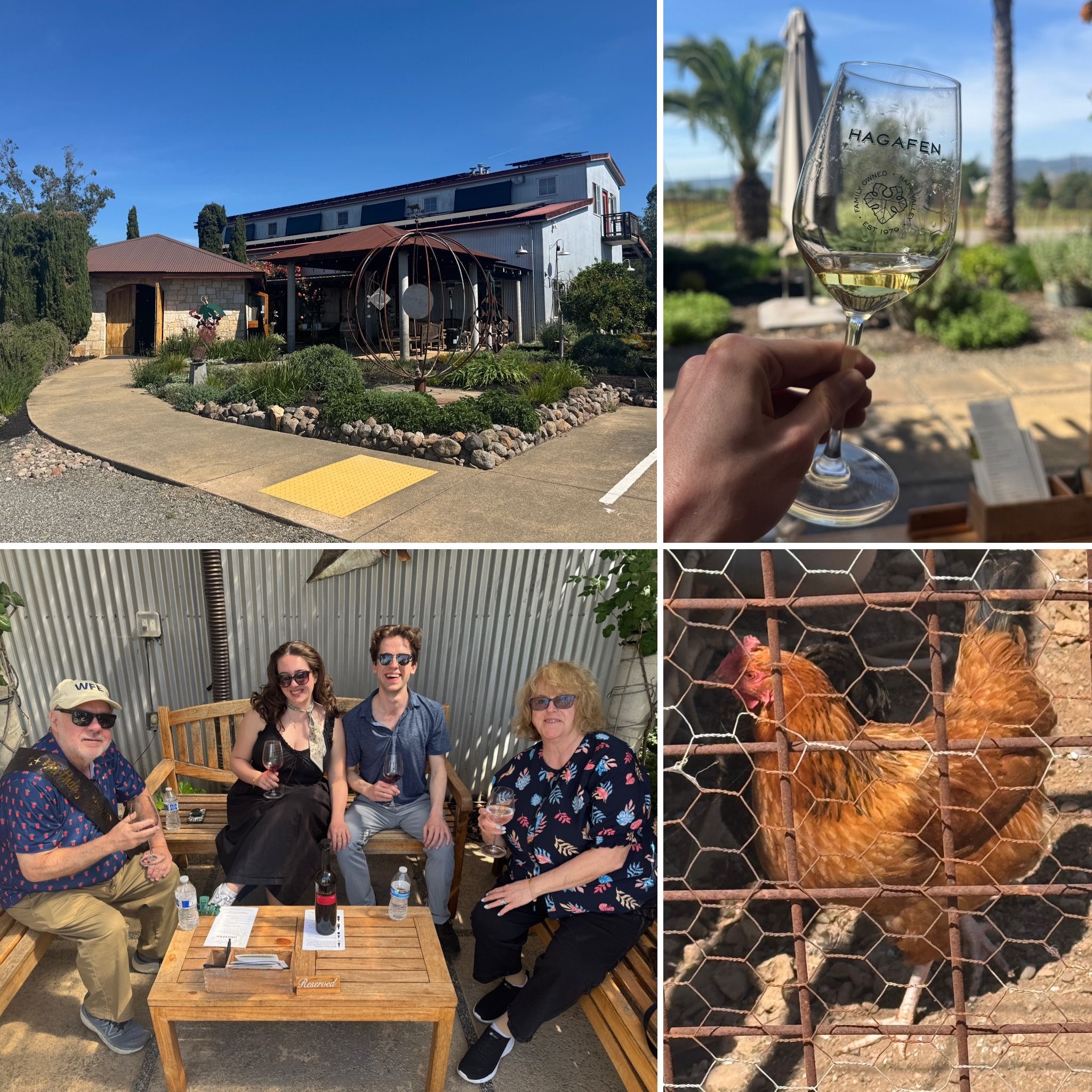 Hagafen is Hebrew for grape vine, and they had an eclectic variety of grape vines, including Riesling, Cabernet Franc, and Petit Syrah, in addition to the Napa Valley staples like Cabernet Sauvignon. Over the course of our tasting, I believe we tried 8 or 9 different wines, which was incredible bang for your buck. I love a Riesling, but I was particularly drawn to the Cabernet Sauvignon, barrel-aged for 32 months as opposed to the normal 12-24 months. This mellowed out the tannins of the wine and made it taste older than it was, as the longer the wine is barrel-aged, the more mellow the tannins become (I thought I just had expensive tastes, but now I know I just need to look for red wines that were barrel-aged for longer!) We also got to walk around the property, where we ran into some chickens.