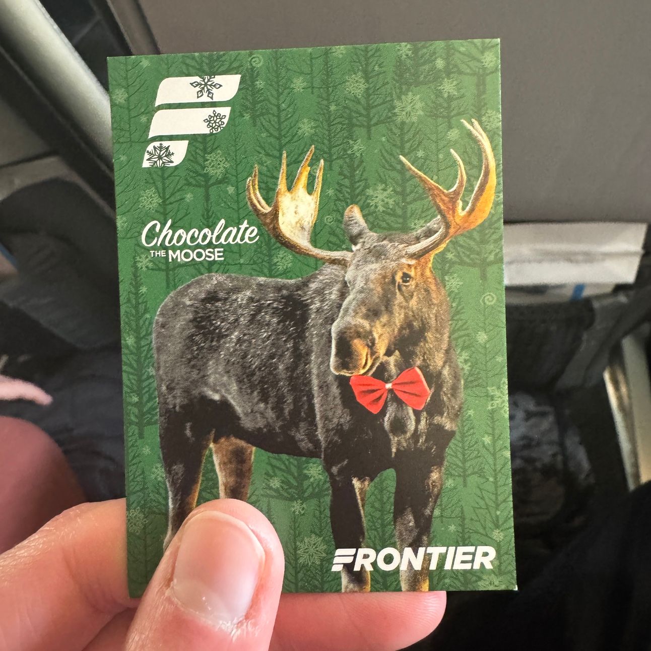 While Frontier will nickel and dime you for just existing on their planes, they make up for it by giving you a free trading card of an animal mascot. Today’s card featured Chocolate the Moose, whose favorite dessert just so happens to be chocolate mousse!